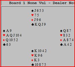 South found small spadde after the double by North to King and spadde back to Ace. After some thought South exited with small diamond. It is irrelevant but Gerry tried KD and ruffed North's Ace. Heart to King, 9, T and J back. Club finesse, heart to Ace, QC, KC and AC and claim for the loss of two spades and a heart. 4S makes the other way as long as you play for the double finesse in diamonds (see previous post!) and not AD and another. It was 4Sx at another two tables for 790 against our 620.